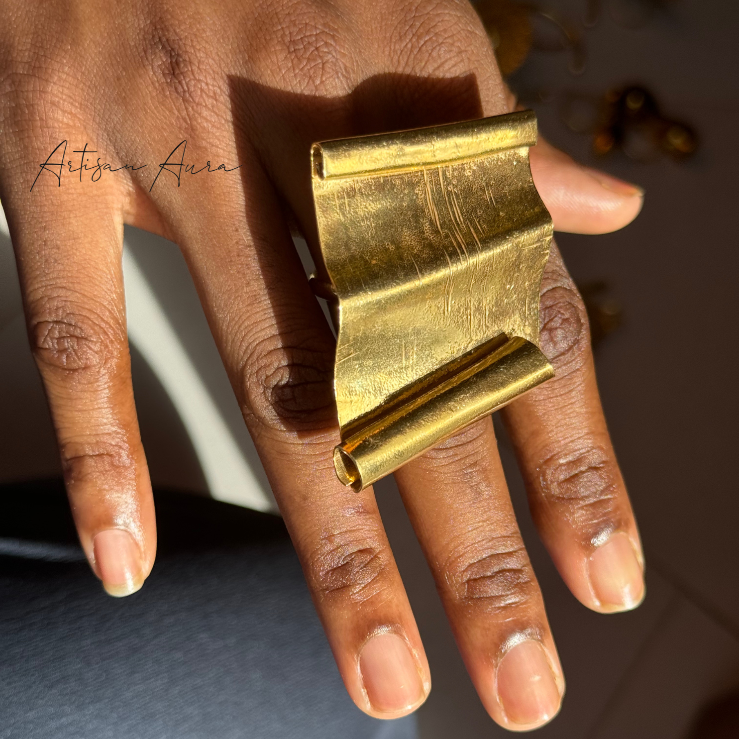 Immerse yourself in the enigmatic allure of the desert with our Crumpled Trapezoid Ring. Crafted in bronze, its shape captures the mesmerizing essence of shifting sands.